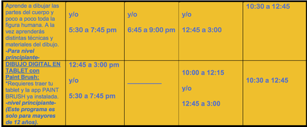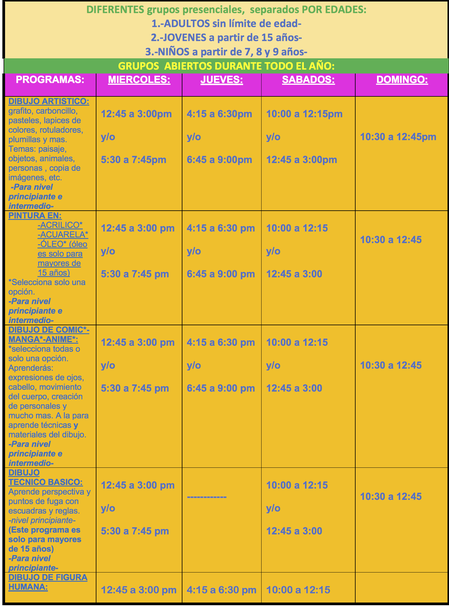PROGRAMAS:-Dibujo artístico- -Dibujo de Figura Humana- -Dibujo de comic,manga,anime- -Dibujo técnico básico- -Pintura en acuarela- -Pintura en acrílico- -Pintura al óleo- -Dibujo al pastel--dibujo en carboncillo- -dibujo a lápiz, carboncillo, grafito, lápices de colores, plumillas, etc- -dibujo y/o pintura en I PAD-